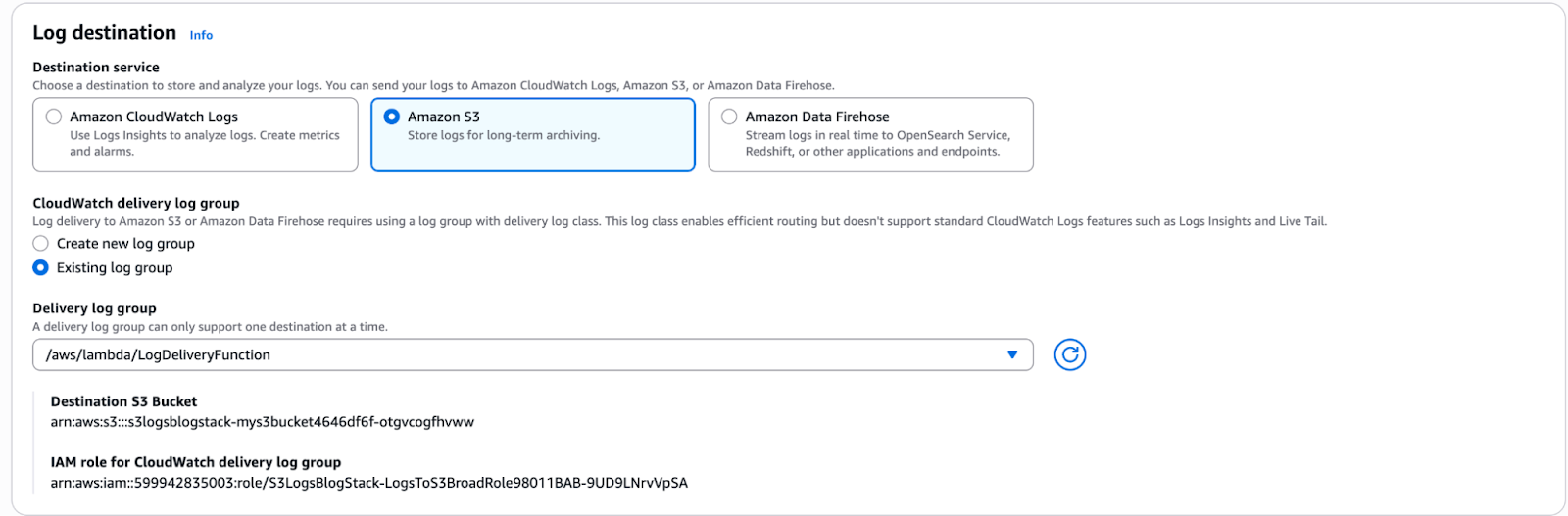 - CloudWatch Log Group (DELIVERY class): A lightweight log group optimized for log delivery use cases.