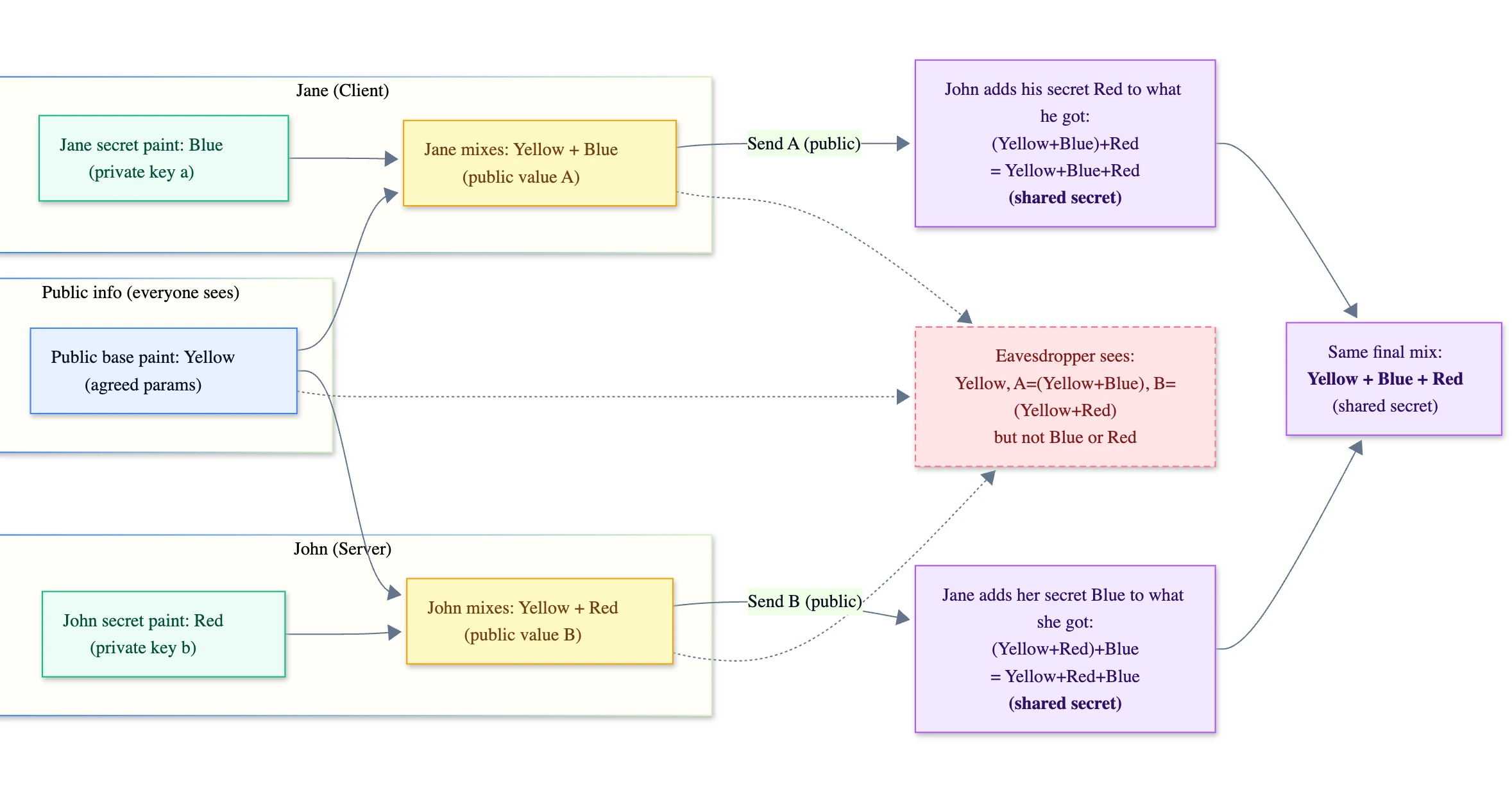 - Jane mixes Yellow + Blue and sends John the result (Jane’s public value).
