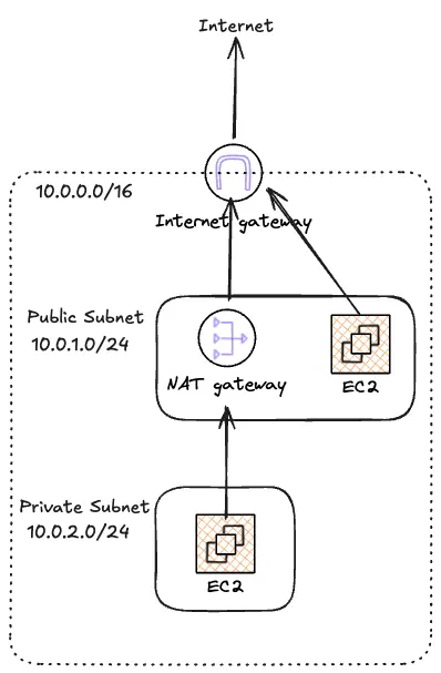 In a standard VPC setup, routing is controlled by Route Tables associated with subnets. When an EC2 instance in a private subnet wants to reach the internet, the traffic flow looks like this: