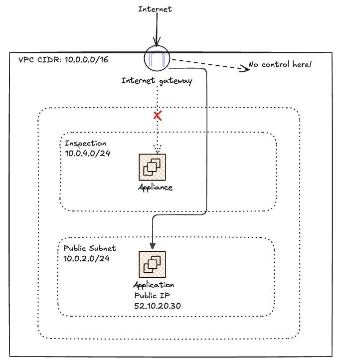 The traffic flows directly from the IGW to the destination subnet based on the destination IP address. There’s no opportunity to intercept it, inspect it, or route it through a security appliance. The subnet route table doesn’t apply to ingress traffic—it only controls where traffic from instances in that subnet goes, not where traffic to those instances comes from.