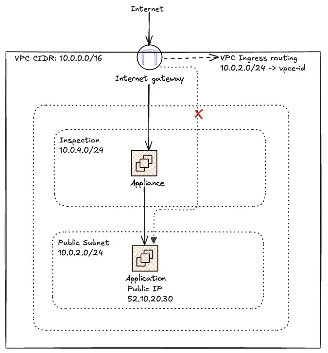 Think of it like airport security. Without ingress routing, passengers (packets) arriving at the terminal (Internet Gateway) show their boarding pass (destination IP) and proceed directly to their gate (application subnet). With ingress routing, every passenger is first directed through a mandatory security checkpoint (firewall appliance), regardless of their final gate.