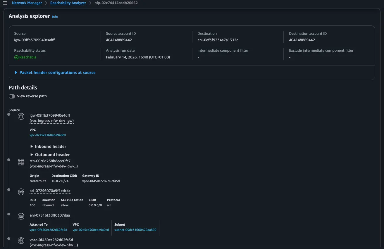 To see the path ingress traffic takes from the IGW via the Network Firewall's endpoint to the web server, run the reachability-ingress-test.sh script and head over to the VPC Reachability Analyzer Console to see the path details.